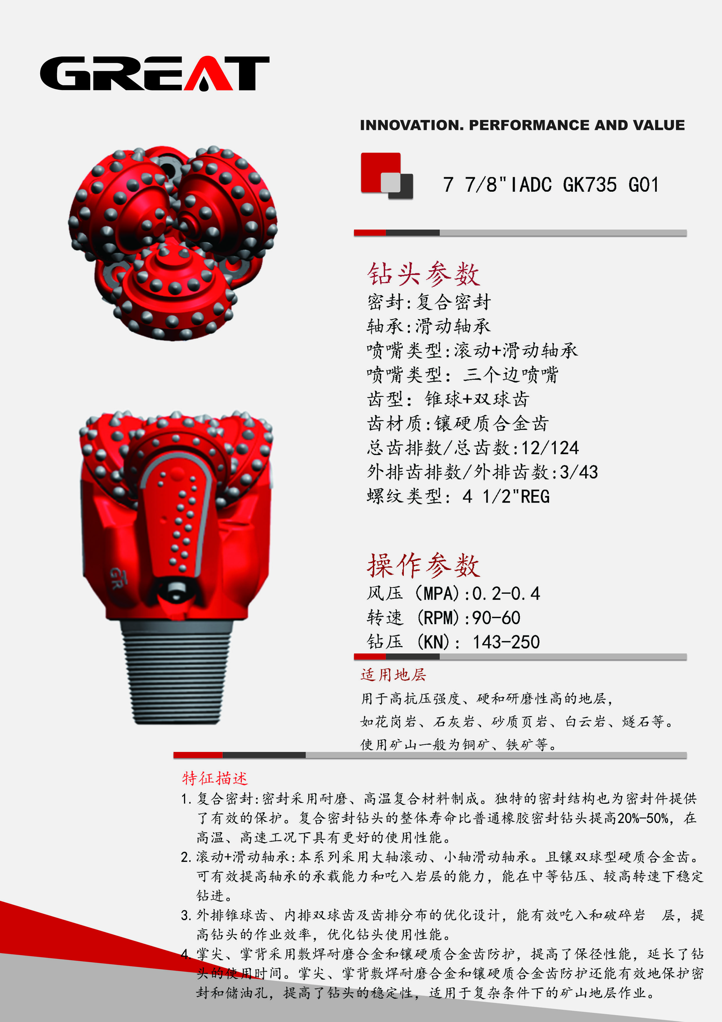 密封采用耐磨、高温复合材料制成,复合密封钻头的整体寿命比普通橡胶密封钻头提高20%-50%,在高温、高速工况下具有更好的使用性能。滚动+滑动轴承的组合有效提高了轴承的承载能力和吃入岩层的能力。掌尖、掌背采用敷焊耐磨合金和镶硬质合金齿防护,提高了保径性能,延长了钻头的使用时间。