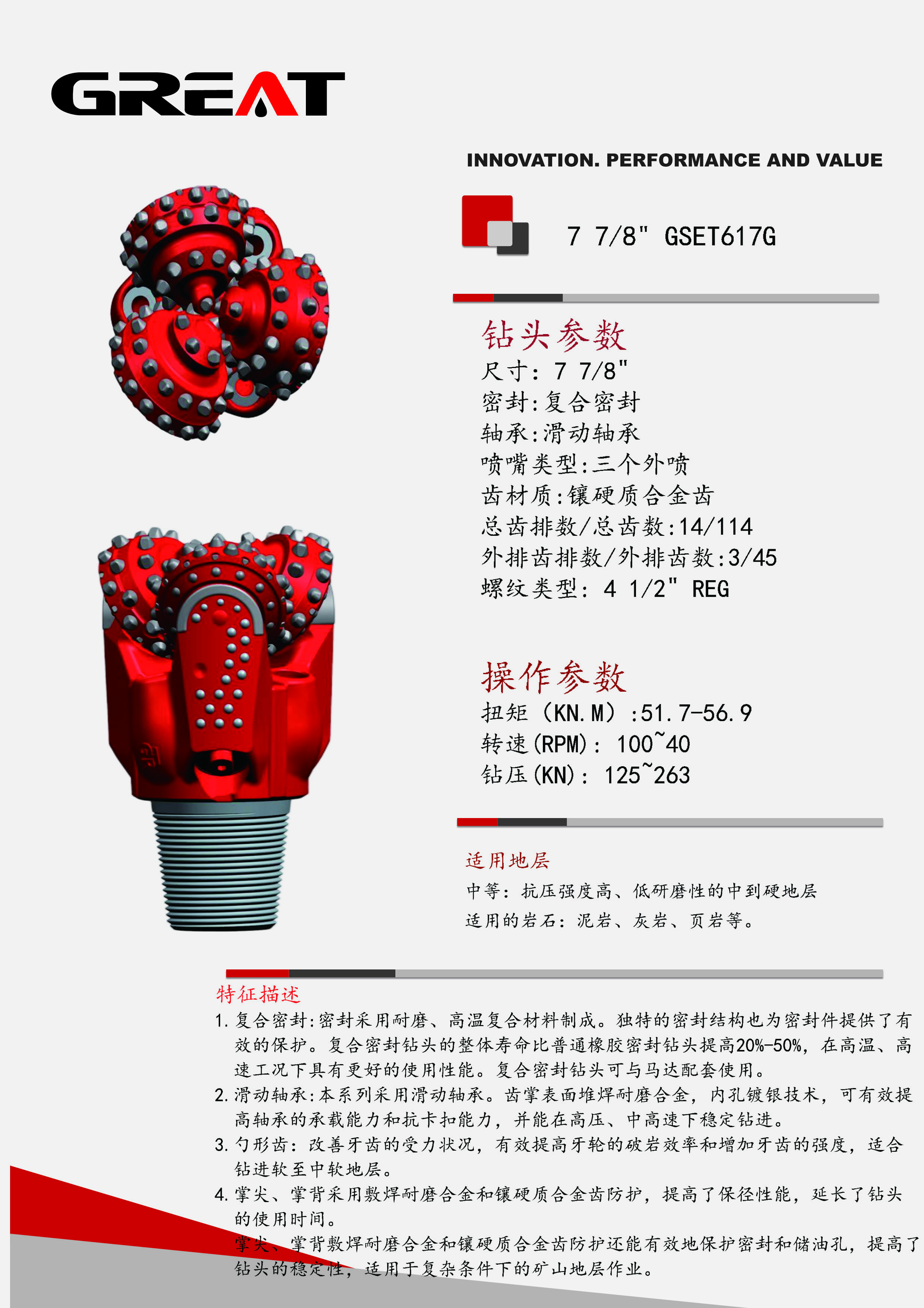 密封采用耐磨、高温复合材料制成。 本系列采用滑动轴承,齿掌表面堆焊耐磨合金,内孔镀银技术,可有效提高钻头的机械钻速。 勺形齿,有效提高牙轮的破岩效率和增加牙齿的强度,适合钻进软至中软地层。 掌尖、掌背采用敷焊耐磨合金和镶硬质合金齿防护,提高了保径性能,延长了钻头的使用时间。