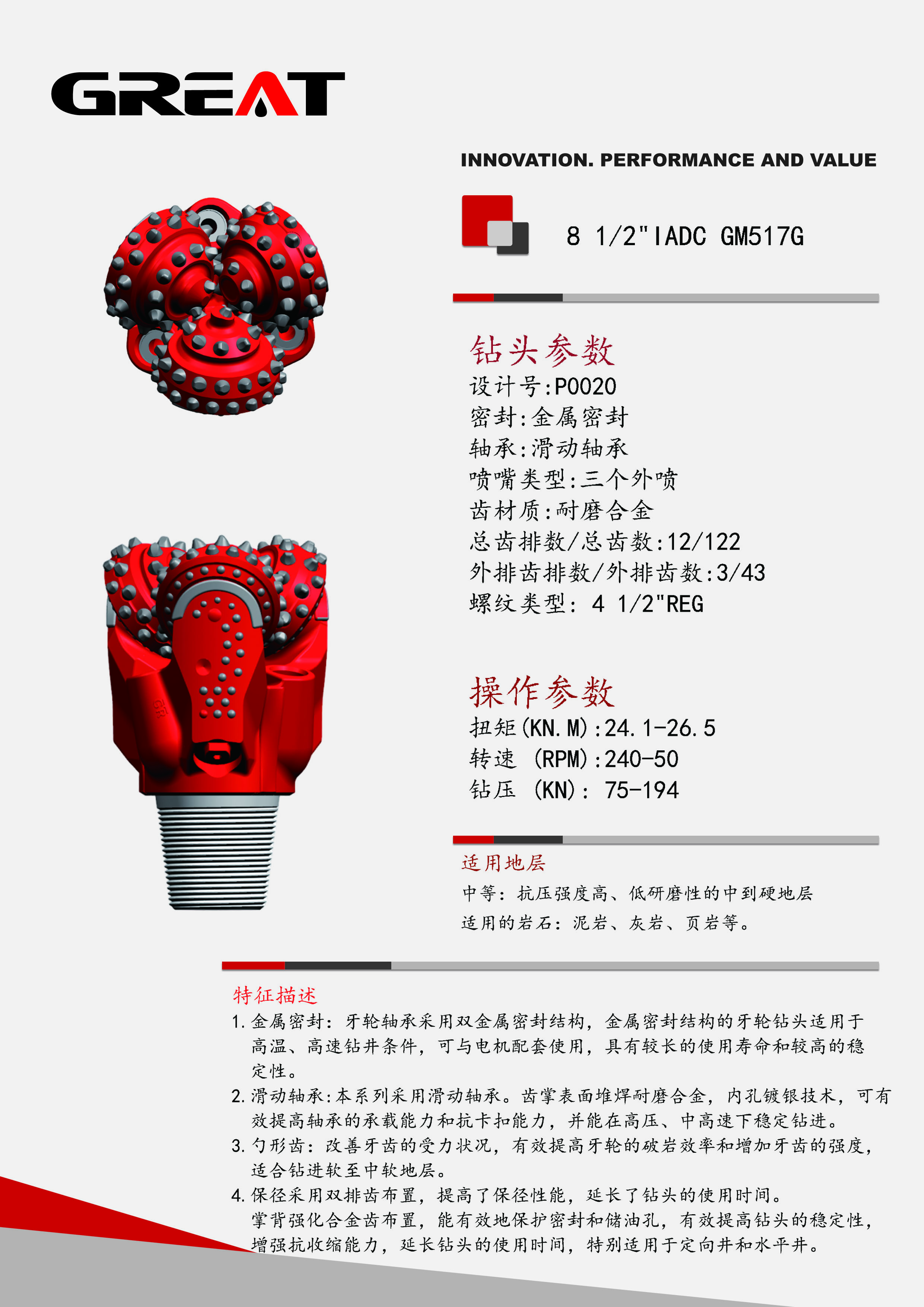 牙轮轴承采用双金属密封结构,适用于高温、高速钻井条件,可与电机配套使用,具有较长的使用寿命和较高的稳定性。 采用滑动轴承,齿掌表面堆焊耐磨合金,内孔镀银技术,可有效提高钻头的机械钻速。 勺形齿有效提高牙轮的破岩效率和增加牙齿的强度,适合钻进软至中软地层。 双排齿布置提高了保径性能,延长了钻头的使用时间,掌背强化合金齿布置,能有效地保护密封和储油孔,提高钻头的稳定性,增强抗收缩能力,延长钻头的使用时间。