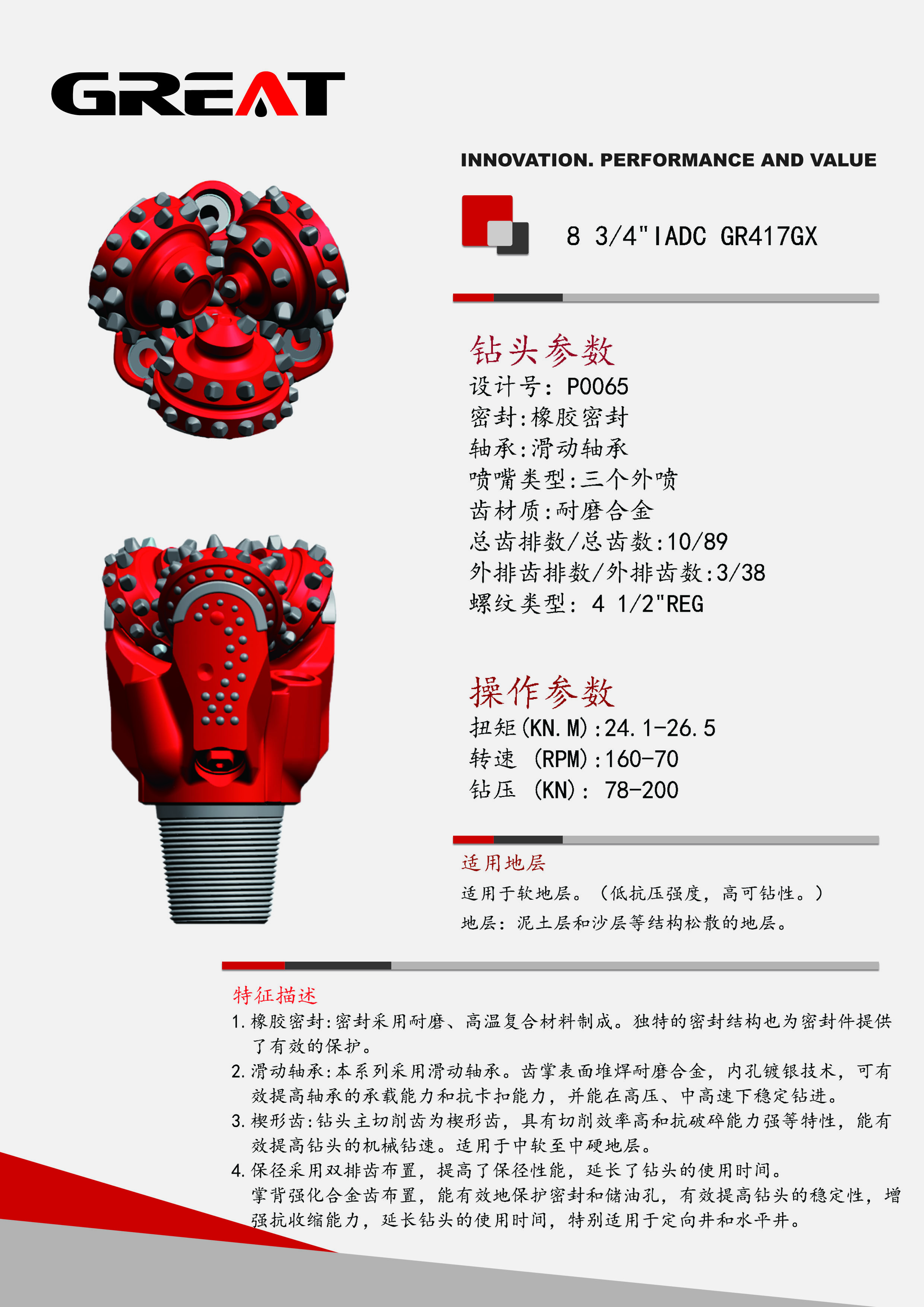 密封采用耐磨、高温复合材料制成。 本系列采用滑动轴承,齿掌表面堆焊耐磨合金,内孔镀银技术,可有效提高轴承的承载能力和抗卡扣能力。 主切削齿为楔形齿,具有切削效率高和抗破碎能力强等特性,有效提高钻头的机械钻速。 双排齿布置提高了保径性能,延长了钻头的使用时间,掌背强化合金齿布置,能有效地保护密封和储油孔,提高钻头的稳定性,增强抗收缩能力,延长钻头的使用时间。