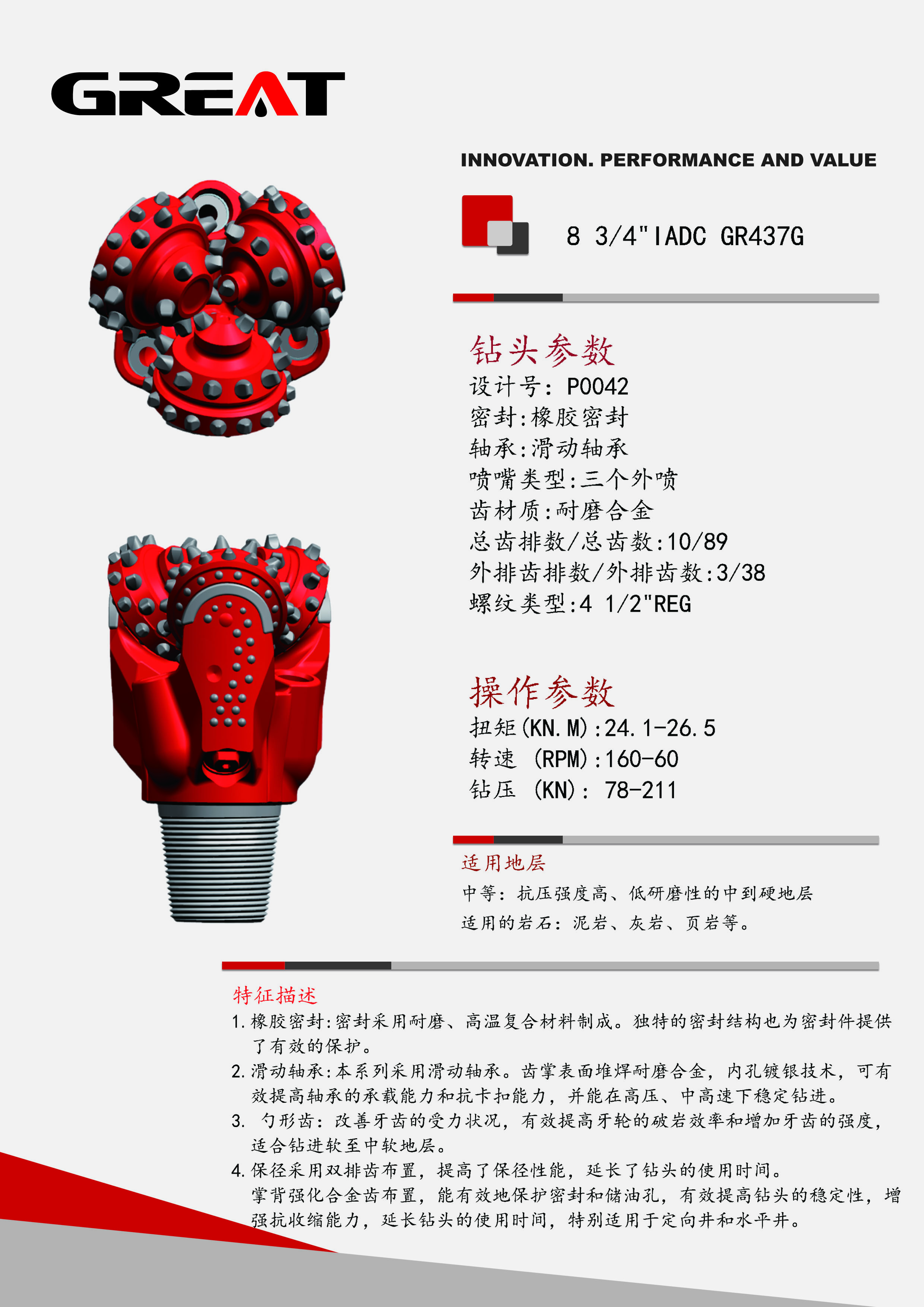 密封采用耐磨、高温复合材料制成。 本系列采用滑动轴承,齿掌表面堆焊耐磨合金,内孔镀银技术,可有效提高钻头的机械钻速。 勺形齿有效提高牙轮的破岩效率和增加牙齿的强度,适合钻进软至中软地层。 双排齿布置提高了保径性能,延长了钻头的使用时间,掌背强化合金齿布置,能有效地保护密封和储油孔,提高钻头的稳定性,增强抗收缩能力,延长钻头的使用时间。