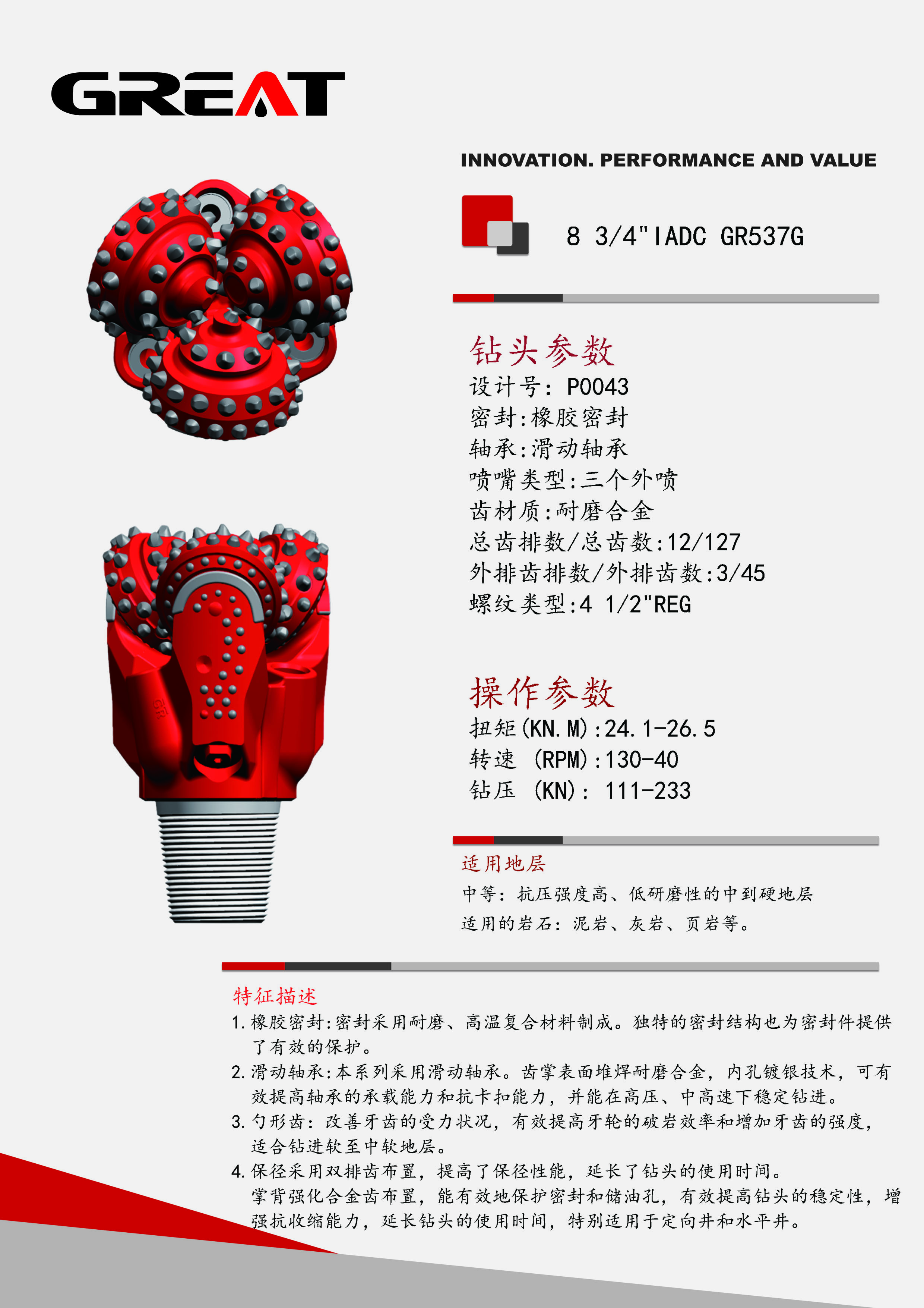 密封采用耐磨、高温复合材料制成。 本系列采用滑动轴承,齿掌表面堆焊耐磨合金,内孔镀银技术,可有效提高轴承的承载能力和抗卡扣能力。 勺形齿有效提高牙轮的破岩效率和增加牙齿的强度,适合钻进软至中软地层。 双排齿布置提高了保径性能,延长了钻头的使用时间,掌背强化合金齿布置,能有效地保护密封和储油孔,提高钻头的稳定性,增强抗收缩能力,延长钻头的使用时间。