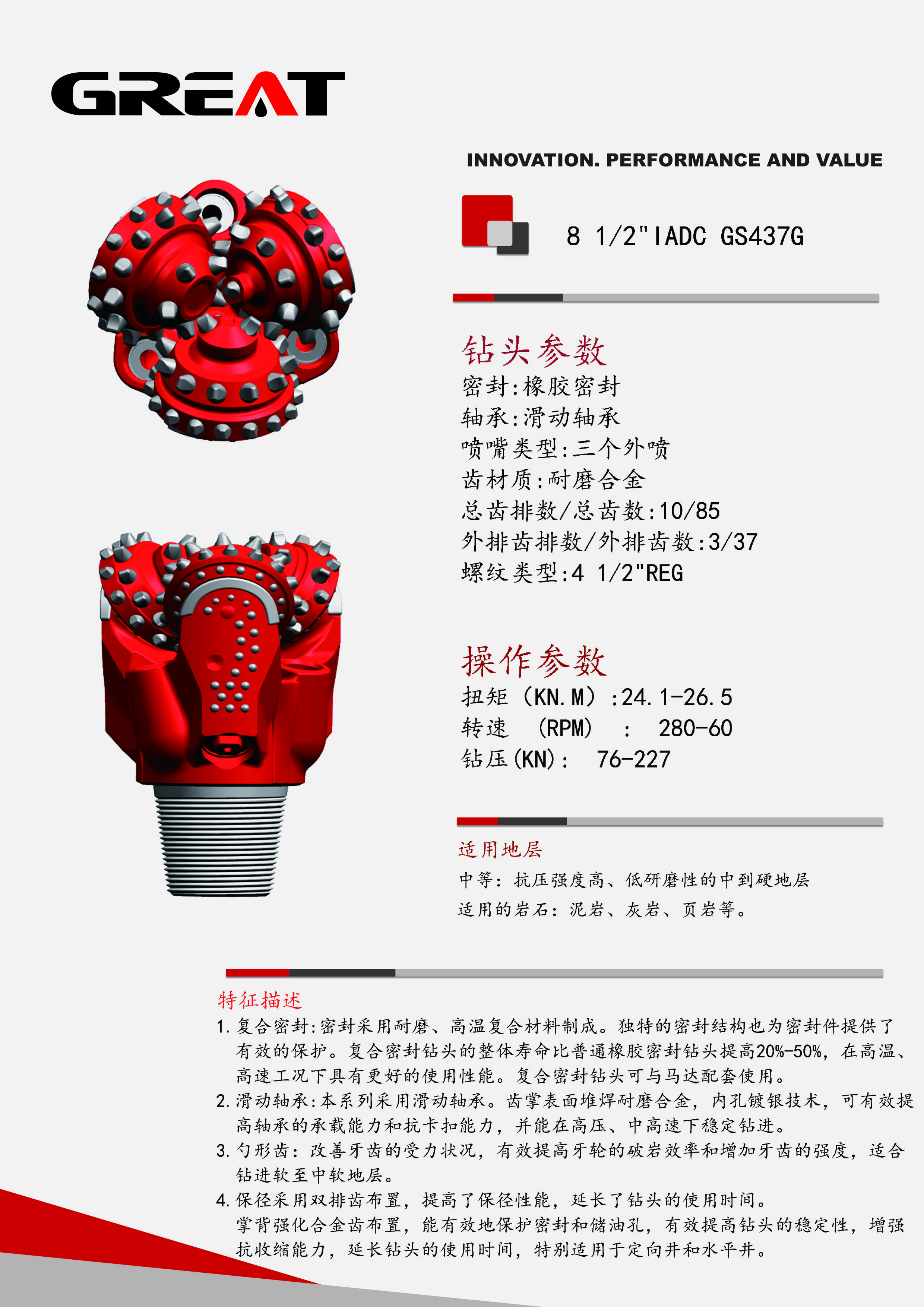 密封采用耐磨、高温复合材料制成,复合密封钻头的整体寿命比普通橡胶密封钻头提高20%-50%。 本系列采用滑动轴承,齿掌表面堆焊耐磨合金,内孔镀银技术,可有效提高轴承的承载能力和吃入岩层的能力,能在高压、中高转速下稳定钻进。 双排齿布置提高了保径性能,延长了钻头的使用时间,掌背强化合金齿布置,能有效地保护密封和储油孔,提高钻头的稳定性,增强抗收缩能力,延长钻头的使用时间。
