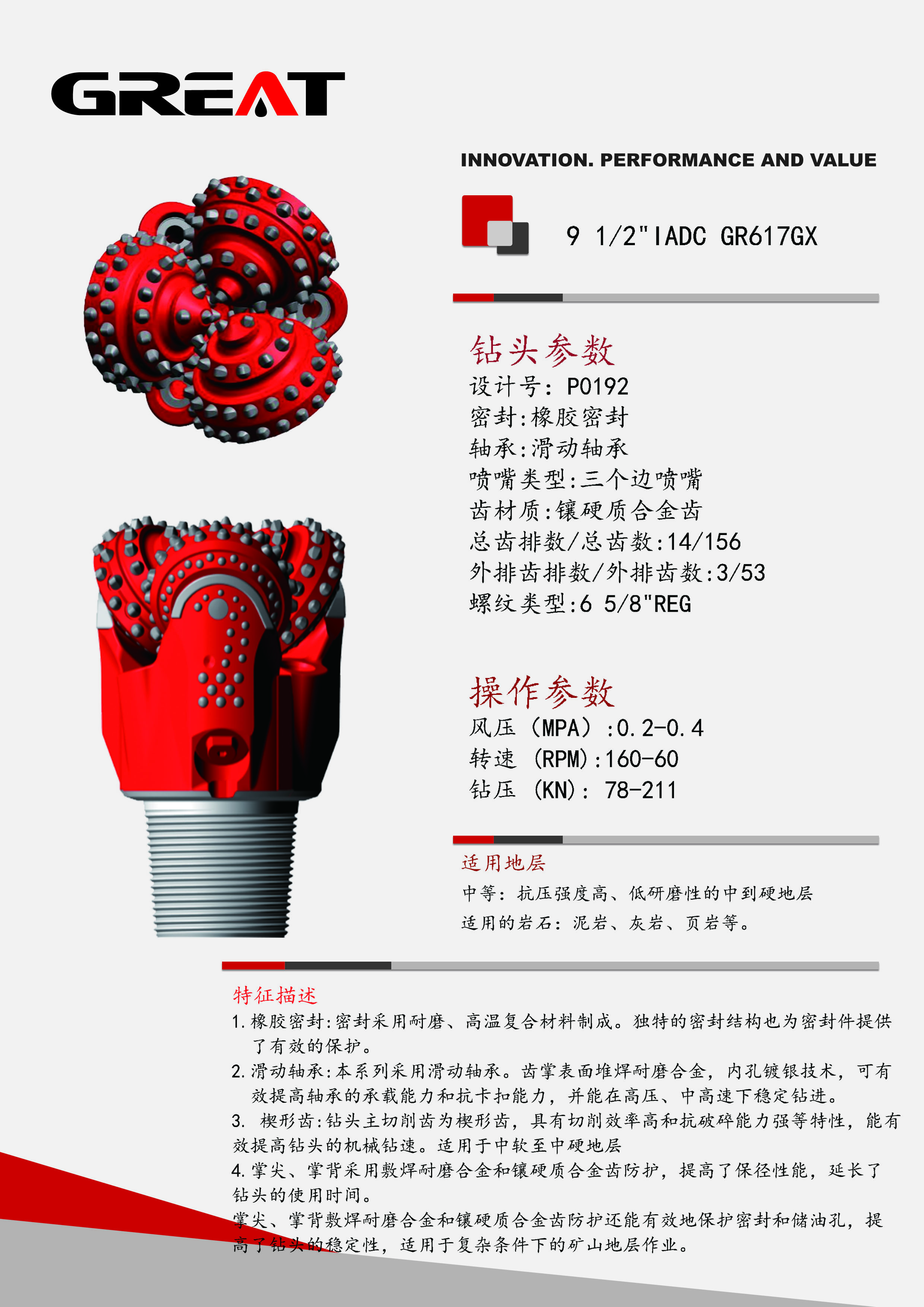 密封采用耐磨、高温复合材料制成。 本系列采用滑动轴承,齿掌表面堆焊耐磨合金,内孔镀银技术,可有效提高轴承的承载能力和抗卡扣能力。 主切削齿为楔形齿,具有切削效率高和抗破碎能力强等特性,有效提高钻头的机械钻速,适合钻中软至中硬地层。 掌尖、掌背敷焊耐磨合金齿和镶硬质合金齿布置,能有效地保护密封和储油孔,提高钻头的稳定性。