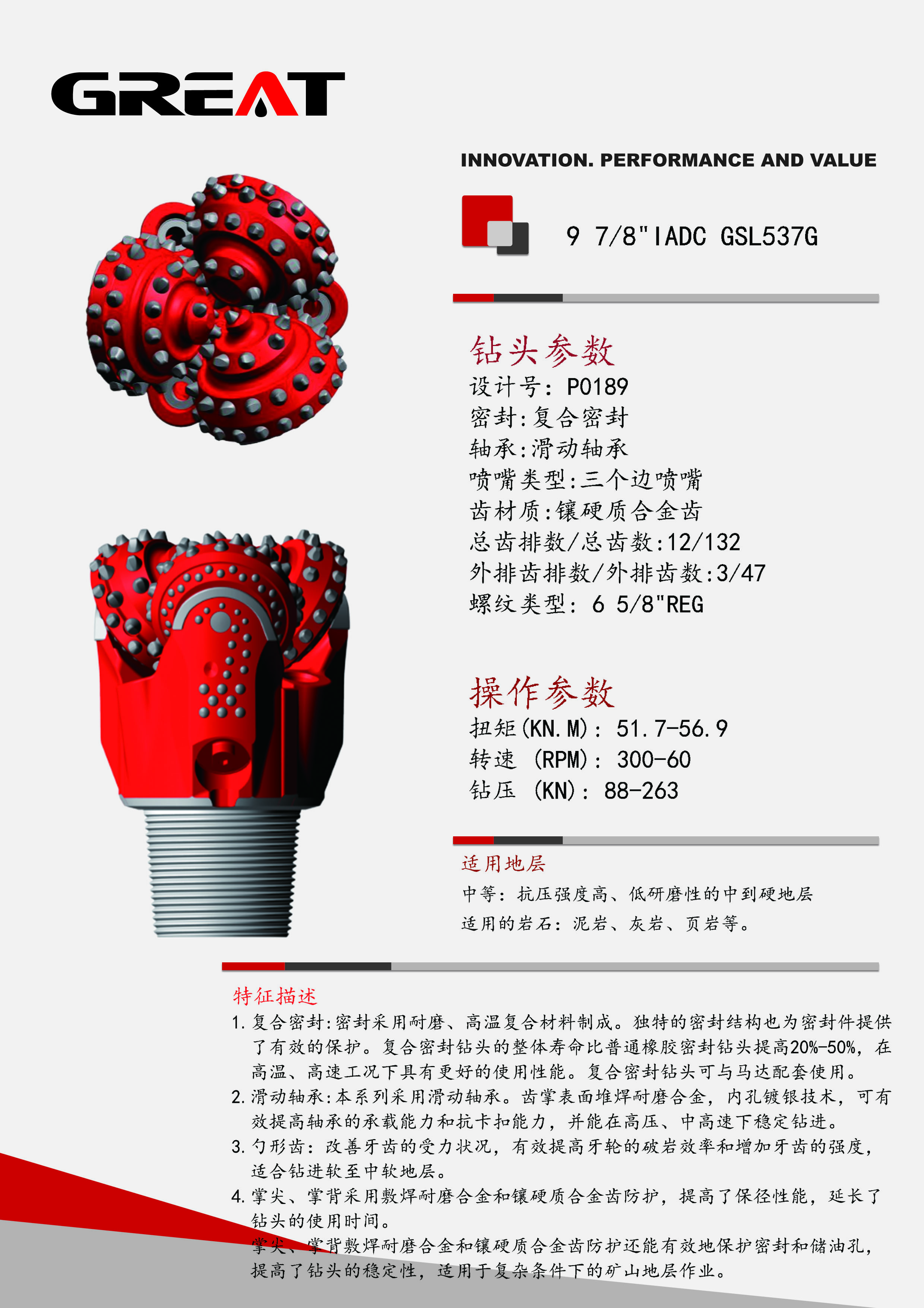 密封采用耐磨、高温复合材料制成,复合密封钻头的整体寿命比普通橡胶密封钻头提高20%-50%。 本系列采用滑动轴承,齿掌表面堆焊耐磨合金,内孔镀银技术,可有效提高钻头的机械钻速。 勺形齿有效提高牙轮的破岩效率和增加牙齿的强度,适合钻进软至中软地层。 掌尖、掌背采用敷焊耐磨合金和镶硬质合金齿防护,提高了保径能力,延长了钻头的使用时间。