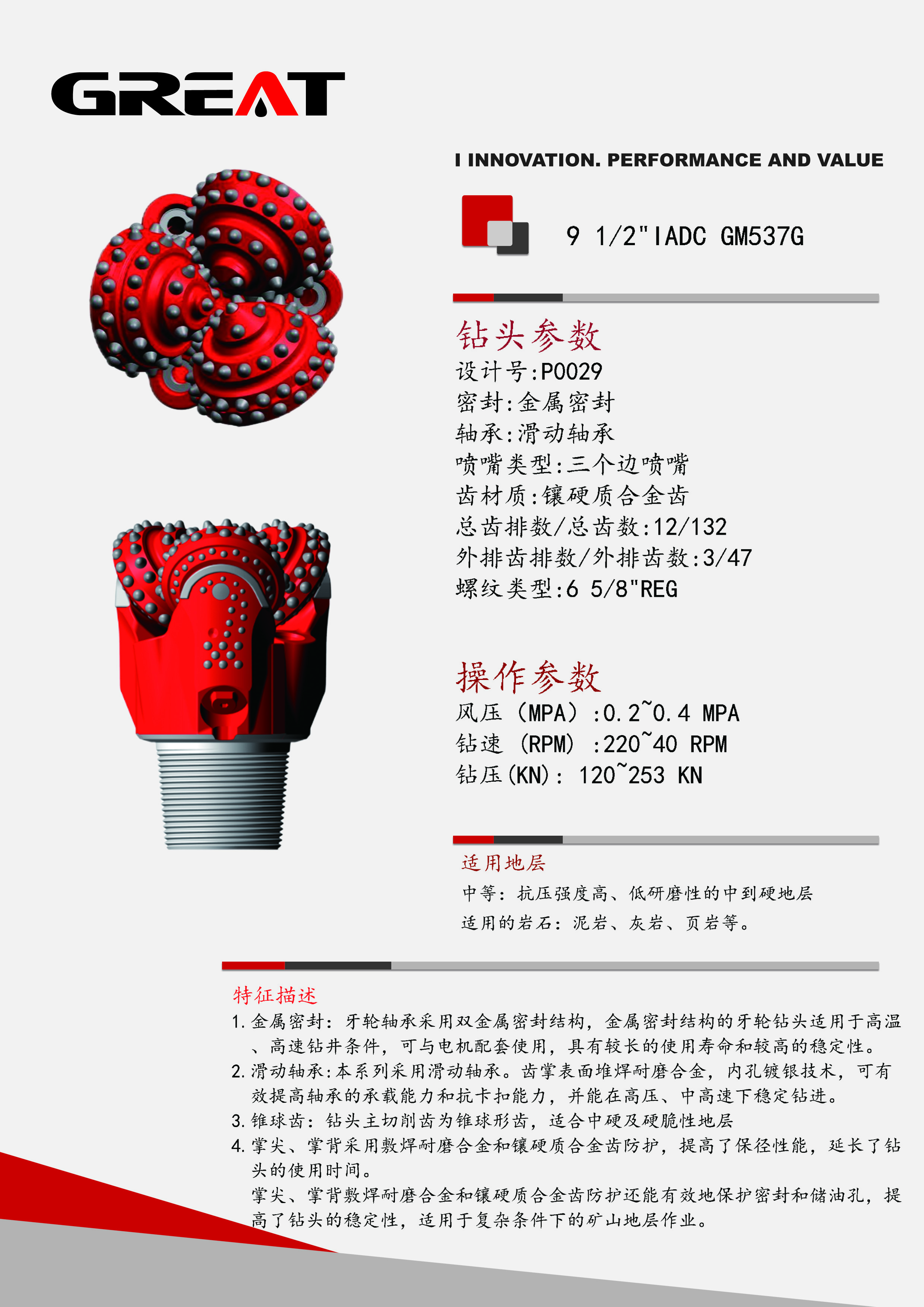 牙轮轴承采用双金属密封结构,金属密封结构的牙轮钻头适用于高温、高速钻井条件,可与电机配套使用,具有较长的使用寿命和较高的稳定性。 本系列采用滑动轴承,齿掌表面堆焊耐磨合金,内孔镀银技术,可有效提高轴承的承载能力和抗卡扣能力。 锥球齿适合中硬及硬脆性地层。 掌尖、掌背采用敷焊耐磨合金和镶硬质合金齿防护,提高了保径能力,延长了钻头的使用时间。