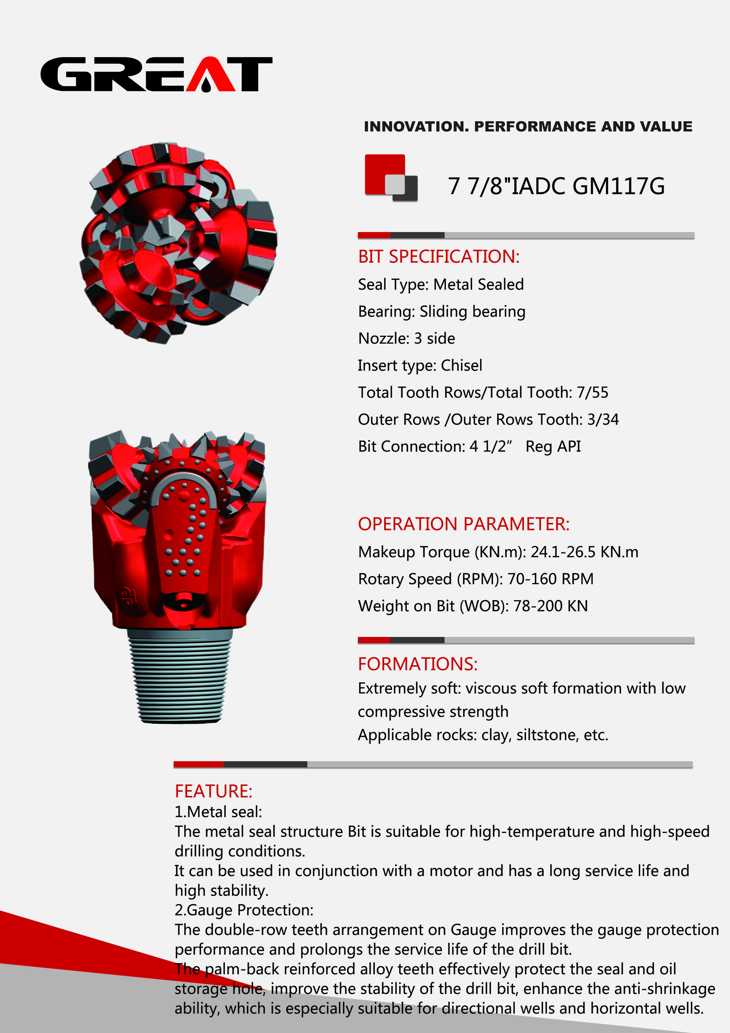 1.Metal seal: The metal seal structure Bit is suitable for high-temperature and high-speed drilling conditions. It can be used in conjunction with a motor and has a long service life and high stability. 2.Gauge Protection: The double-row teeth arrangement on Gauge improves the gauge protection performance and prolongs the service life of the drill bit. The palm-back reinforced alloy teeth effectively protect the seal and oil storage hole,improve the stability of the drill bit,enhance th