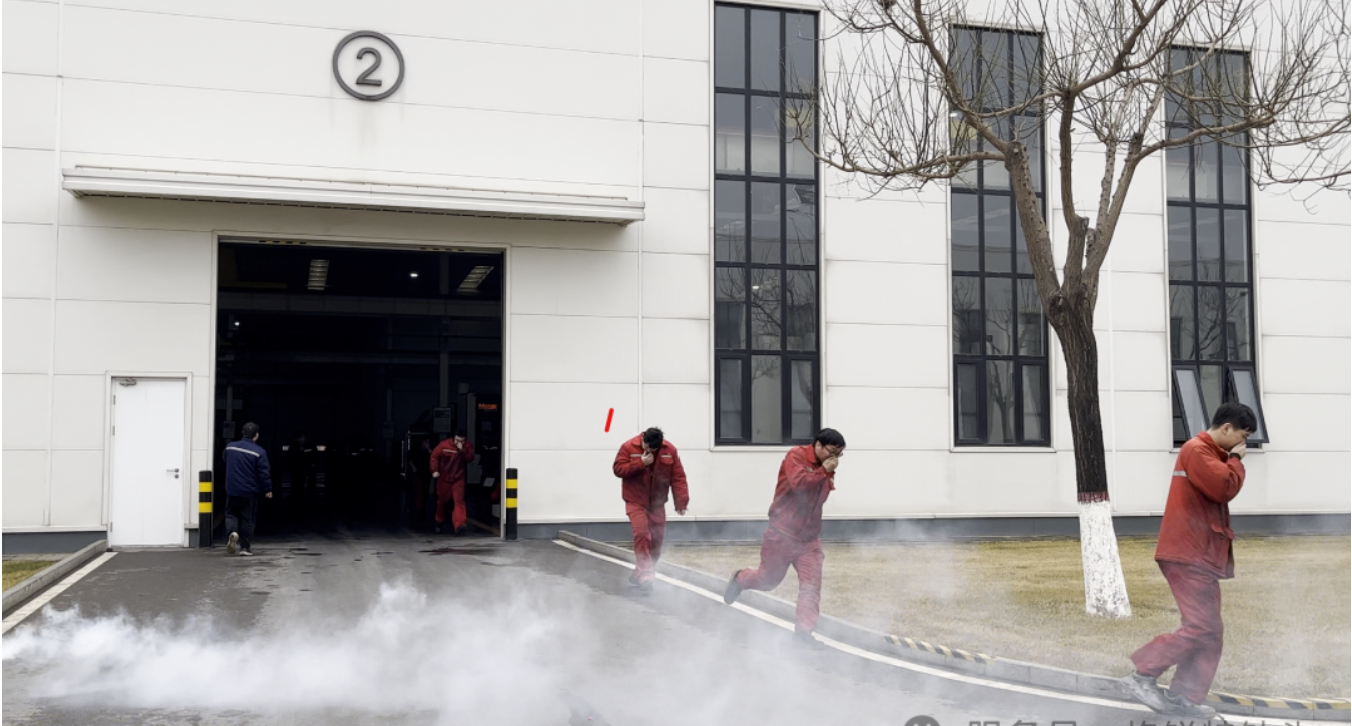 急促的消防警报响起,三个车间模拟着火点同步“起火”,烟雾弥漫,应急状态迅速启动。各车间引导员到位指引,提醒员工“捂口鼻、弯腰低姿、有序撤离”。员工们听从指挥,沿预设路线快速撤离至安全集合点,全程紧张有序。各部门负责人迅速清点人数、汇报情况,确保疏散环节闭环。