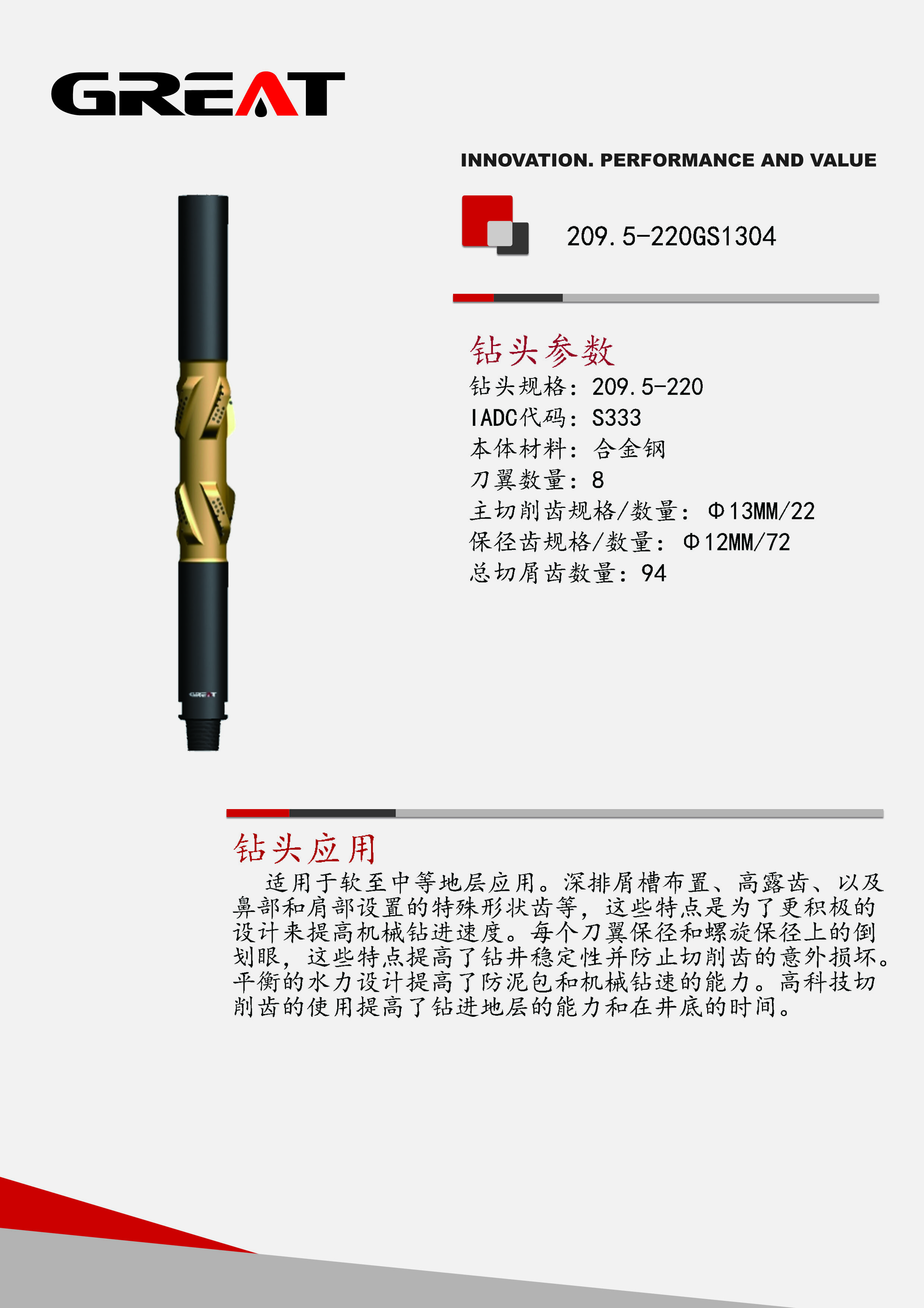 适用于软至中软底层应用。深排屑槽布置、高露齿、以及鼻部和肩部设置的特殊形状齿等,这些特点是为了更积极的设计来提高机械钻进速度。每个刀翼保径和螺旋保径上的倒划眼,这些特点提高了钻井稳定性并防止切削齿的意外损坏。平衡的水力设计提高了防泥包和机械钻速的能力。高科技切削齿的使用提高了钻进底层的能力和在井底的时间。